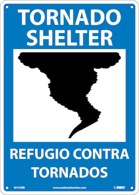 National Marker "Tornado Shelter " bilingual safety sign with graphic measures 14" x 10" and is made rigid plastic material for added durability.