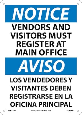 National Marker "Notice Vendors And Visitors Must Register At Main Office" Bilingual safety sign measuring 14" x 10" is made of 0.040" aluminum material for durability.