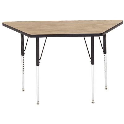 Trapezoidal activity table features high-pressure laminated top with backer sheet, plus standard leg adjustments from 21-30" in 1" increments. Includes 7 mounting screws in bracket and 3 screws in leg plate for maximum strength. Assembly required.