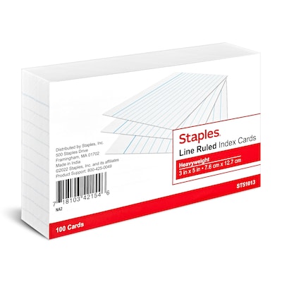 Stock up on supplies with these white lined index cards. The narrow ruling lets you write more lines of notes and create lists. These Staples Brand 3" x 5" white lined index cards feature heavyweight paper that holds up to daily handling and delivers reliable performance.