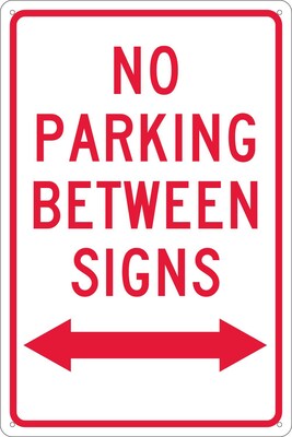 National Marker "No Parking Between Signs" Safety sign with double arrow measures 18" x 12" and is made 0.040" aluminum material for added durability.