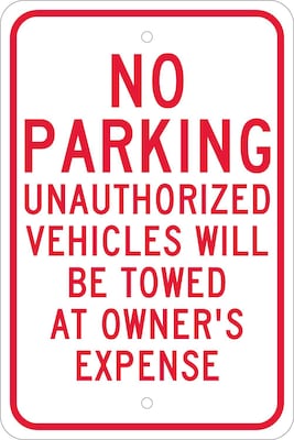 National Marker "No Parking Unauthorized Vehicles Will Be Towed.." Safety sign measures 18" x 12" and is made 0.080" reflective aluminum material for added durability.