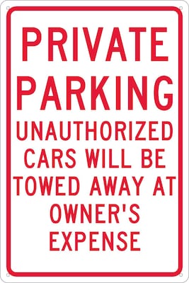 National Marker "Private Parking Unauthorized Cars Will Be Towed.." Safety sign measures 18" x 12" and is made 0.040" aluminum material for added durability.