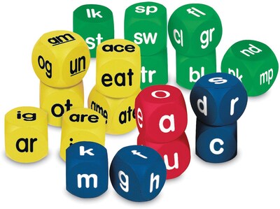 Phonics cube set includes lowercase alphabet cubes (2 red vowel and 4 blue consonant), yellow word families cubes (3 each of two- and three-letter word families) and green blends cubes. Learning Resources Phonics cubes class set for grades preK - 3 consists of lowercase alphabet cubes, yellow word families cubes and green blends cubes. Class set makes learning to read fun.