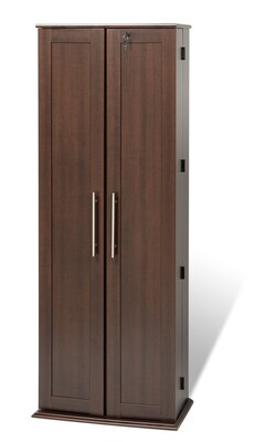 Prepac™ Espresso grande locking media storage cabinet has an adjustable shelf that holds 702 CDs, 448 DVDs, 658 blu-ray discs and 266 VHS cassettes. Cabinet has offset hinge points that allow 180 degree movement for easy and convenient access.