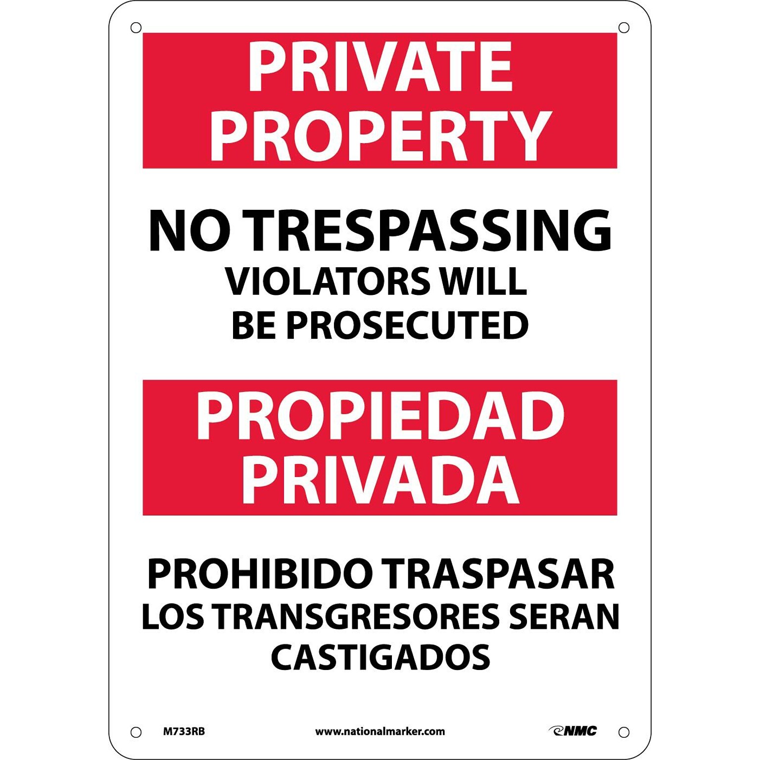 National Marker "Private Property No Trespassing Violators Will Be Prosecuted" bilingual safety sign measures 14" x 10" and is made rigid plastic material for added durability.