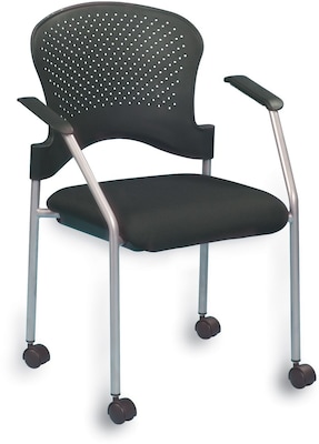 Supplying your training room or boardroom with adequate seating options is a simple matter with the Raynor Eurotech Breeze side chair. Made of gray powder-coated steel with a black fabric seat, each of these four-leg chairs features a perforated back with built-in lumbar support for comfort and wheels for easy mobility. Perhaps best of all, the Breeze chair is stackable, so compact storage is never a problem.