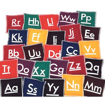 S&S® Square English alphabet beanbag set of 26 measuring 5" is made of washable, long-lasting canvas and filled with plastic pellets.