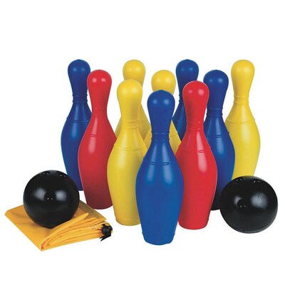 S&S® Big 10 Bowling set can be put up in an available space. Set includes 11" - 12" high lightweight pins made of plastic, two 5" dia plastic balls and a carrying case.