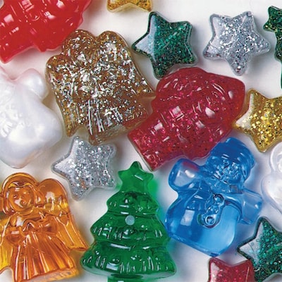 Christmas bead assortment bag features 12-17mm bead with 4mm holes, includes angels, snowmen, christmas trees, santas, glitter stars and sold as 270 beads per 1/2 lbs. bag.