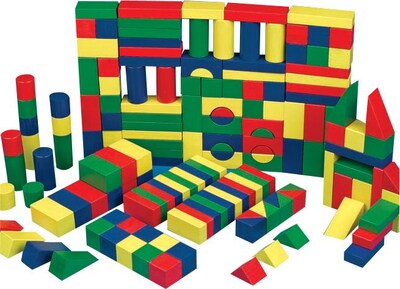 S&S® Colored wooden block set includes 65 attractive pieces in assorted shapes and sizes for kids to have fun.