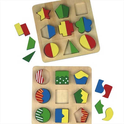 S&S® Wood puzzle board consists of non-toXic painted halves that are used to by children to match 9 puzzles. Puzzle board measuring 8" teaches to differentiate between the colors and shapes and is sold as 2 per set.