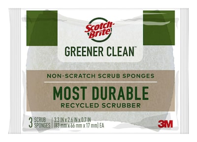 - RECYCLED DISH SPONGES: One 3-pack of Scotch-Brite Greener Clean Non-Scratch Scrub Sponges, kitchen sponges made with 100% recycled scrubbing fibers so you can make a difference with every clean