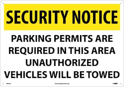 National Marker "Security Notice Parking Permits Are Required In This Area Unauthorized Vehicles Will Be Towed" Safety sign measures 14" x 20" and is made 0.040" aluminum material for added durability.