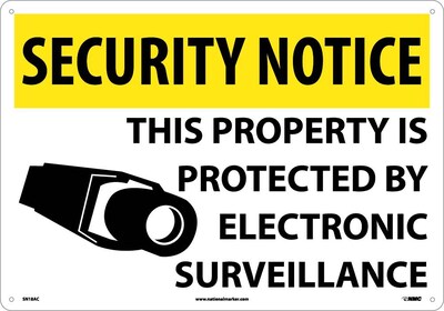National Marker "Security Notice This Property Is Protected By Electronic Surveillance" Safety sign measures 14" x 20" and is made 0.040" aluminum material for added durability.