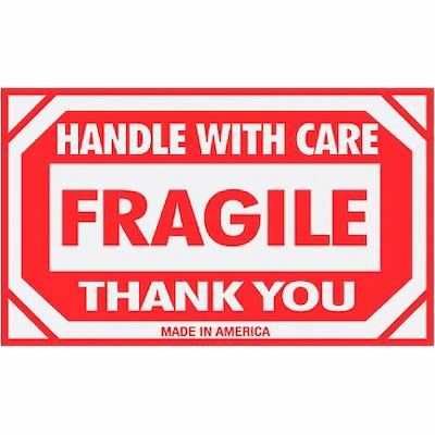 Self-adhesive "HANDLE WITH CARE FRAGILE THANK" labels for international box packaging and pallet shipping. See Product Details chart for more information.