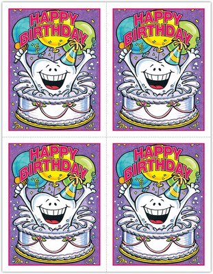 Attention-getting Tooth in Cake graphic and "Happy Birthday" on front. Printed on uncoated laser stock with micro-perfs; 4 postcards per sheet. Blank backs for personalization. 200 cards per box. Sheet size: 8-1/2" x 11"; card size: 4-1/4" x 5-1/2".