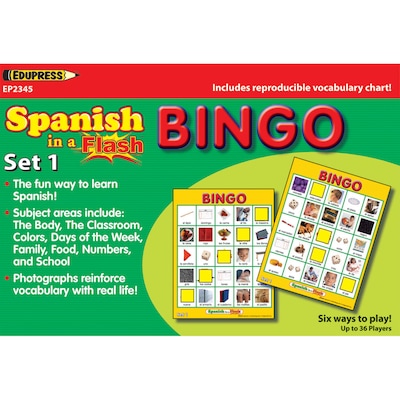 Edupress® Spanish In A Flash Bingo game set 1 measures 7" x 9" and is ideal for age group of 3 - 8 yrs. Card set includes 100 calling cards and 500 bingo markers.