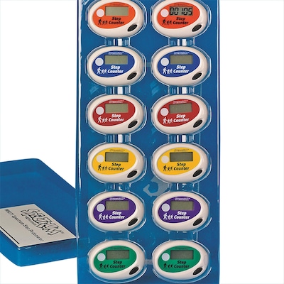 Spectrum™ Pedometer set includes 12 pedometers and lets you determine the distance traveled or calories burned with one button operation.