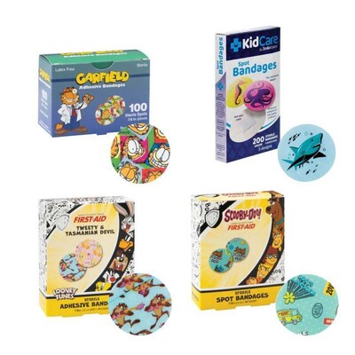 Stock up on Spot Bandages! This Spot Bandage Sampler contains multiple boxes of our most popular spot bandage designs! 400 bandages in all! These bandages are latex-free. Never run out of spot bandages and always have the most popular bandage designs in your selection. Shots and immunization bandages from SmileMakers cheer up patients of all ages