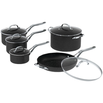 Starfrit The Rock 10-Piece Cookware Set is a non-stick, aluminum set that has a durable rock like finish that resists scratch and abrasion. It includes 11" deep fry pan with lid, 3qt saucepot with lid and more.