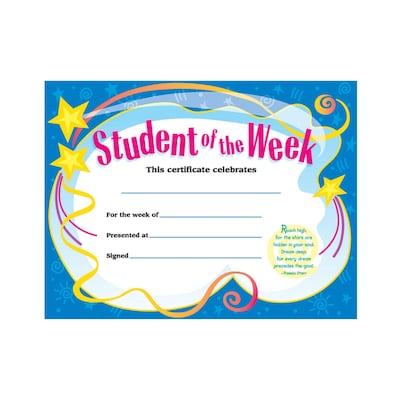 Trend Enterprises® "Student of the Week" Certificate in white color measures 11" x 8 1/2" and features inspiring quotations as well as contemporary artwork. Certificate with seal has blue color border to give an elegant look, sold as 30 per pack.