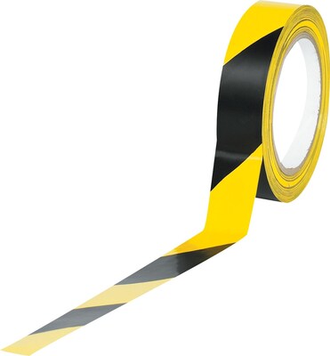 1" wide black/yellow industrial striped heavy-duty vinyl safety tape resists oil, grease, moisture, solvents and scuffs includes 3 per pack.