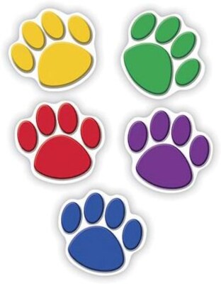 Colorful paw prints accents decorative artwork to dress up classroom walls and doors, label bins and desks, or accent bulletin boards.