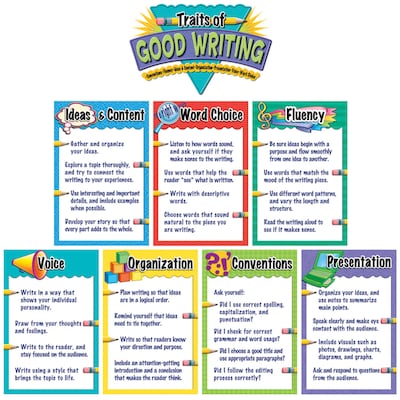Teacher Created Resources® Traits of good writing bulletin board set of 7 includes a 4 pages teacher's guide with related tips and activities. Bulletin board set has visual reminders that help young writers to become master in each trait.