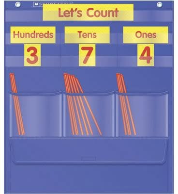 Teacher's Friend® Counting caddie and place value pocket chart for grades K - 5 features storage pocket for cards/straws and help teacher to organize a classroom. Nylon chart in blue color includes number/1 title/place value card and activity guide.
