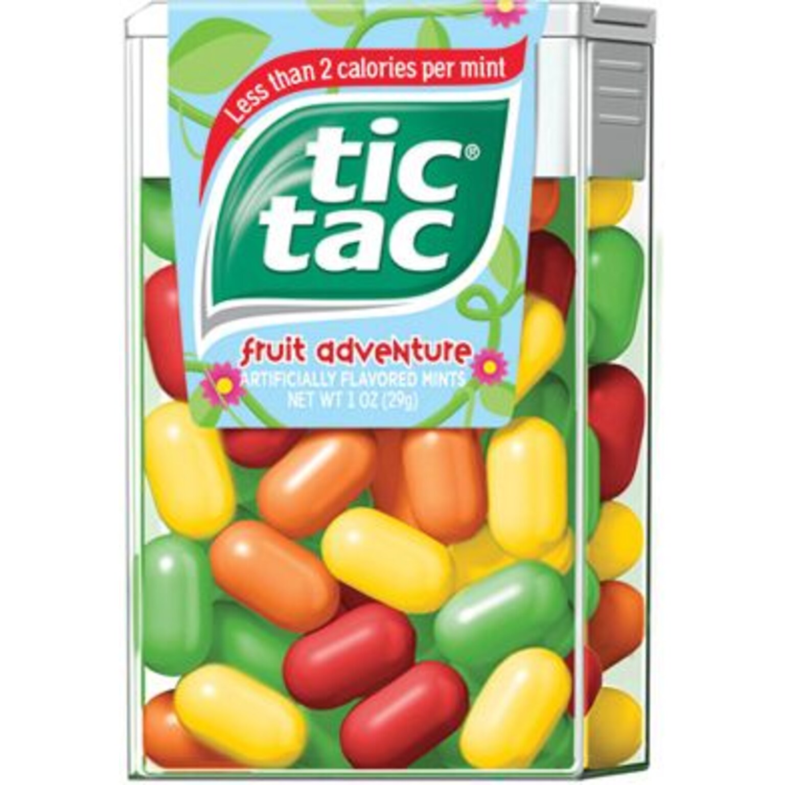 Tic Tac Mint in fruit adventure flavor that refreshes your mouth and comes in a convenient pop-top container making it suitable for traveling or sharing, sold as 12 packs per box.