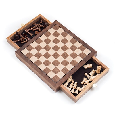 - Board has fabric-lined drawers to hold pieces when not in use