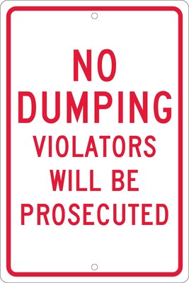 National Marker "No Dumping Violators Will Be Prosecuted" Safety sign measures 18" x 12" and is made 0.063" aluminum material for added durability.