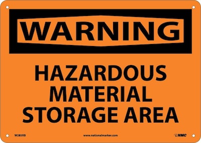 National Marker "Warning Hazardous Material Storage Area" Safety sign measuring 10" x 14" is made of rigid plastic material for durability.