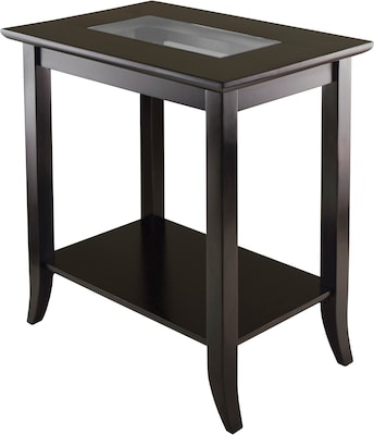 Winsome Genoa rectangular end table features a shelf for convenient storage. Table frame and the shelf is dark espresso finished with a tempered glass top to offer an elegant look to suit any of your existing decor.