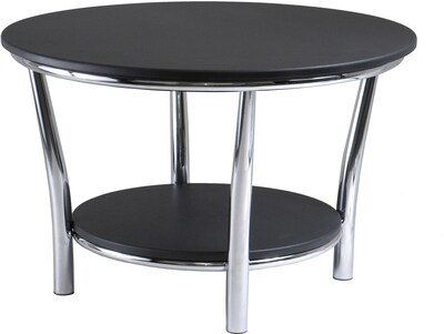 Winsome Maya round coffee table with black large top has a spacious lower shelf to store magazines or books. Table has a polished steel frame with MDF tabletop and shelf.