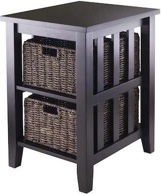 Winsome Morris side table made of solid wood with espresso finish enhances high durability and classic look.Table features 2 shelves provided to store 2 foldable baskets made of cornhusk ideal for storage stuffs and needs some assembly to setup.