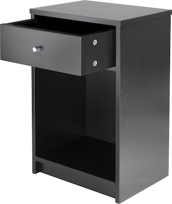 Winsome Squamish accent table features one drawer for spacious storage and open cabinet for display of items. Transitional style table has black veneer on composite wood construction.