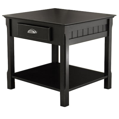 Winsome Timber end table made from solid beechwood with a rich black finish has paneled sides and plain carved legs.Contemporary table features a drawer for safe storage and open shelf for display of items.