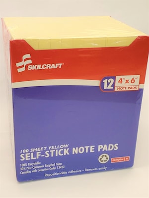 AbilityOne SkilCraft Self-Stick Note Pad, 4" x 6", Yellow, 100 Sheets/Pad, 12 Pads/Pack (864D)