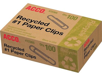 ACCO Recycled Paper Clips, #1, Silver, 100/Box, 10 Boxes/Pack (A7072365A)