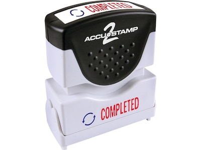 Identify fully processed paperwork with this two-color stamp to help streamline paperwork processing and maintain accurate records. This 0.5 x 1.6-inch stamp creates the message COMPLETED in red next to a blue circle of arrows. This pre-inked Accu-Stamp 2 COMPLETED stamp delivers thousands of clear impressions before requiring additional ink.