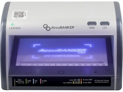 The AccuBANKER counterfeit bill/document validator is great for banks, bars, gas stations, nightclubs, restaurants, movie theaters, and other large retail stores. The validator is built with an advanced LED technology which provides a long-lasting, superbright UV and white LED light source. This is extremely convenient and eliminates having to frequently replace bulbs like with other conventional lamp detectors, saving the user time, energy, and costs. This compact and easy-to-use unit protects the user against counterfeit currency using three integrated detection methods. The validator requires a manual detection process, which allows the user to check for security features quickly and efficiently by using the LED lights and integrated ruler. These powerful tools allow verifying the security features on bills, credit cards, driver's licenses, passports, and other documents for all countries without any additional programming or software updates.