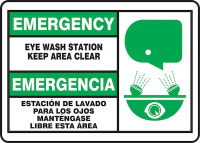 - Legend: "EMERGENCY EYE WASH STATION KEEP AREA CLEAR/EMERGENCIA ESTACION DE LAVADO PARA LOS OJOS MANTENGASE LIBRE ESTA AREA"