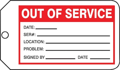 OSHA-compliant tags with the pre-written phrase "OUT OF SERVICE."