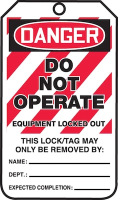 Accuform Signs® "DANGER..LOCKED OUT" PF-Cardstock lockout tag uses warning text to prevent machine operation/power activation. Tag measuring 5 3/4" x 3 1/4" includes 3/8" dia hole for quick and easy fastening, sold as 25 per pack.