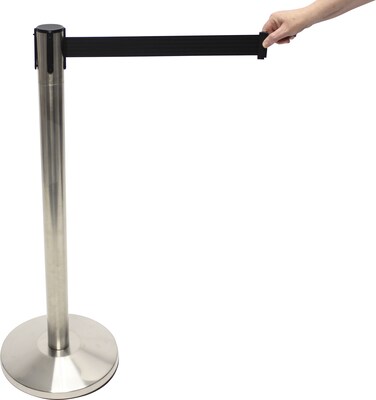 Accuform Signs® Blockade Retractable Belt Tape Barrier, Brushed Steel Post/Black Belt Tape, Each