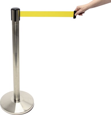 Accuform Signs® Blockade Retractable Belt Tape Barrier, Brushed Steel Post/Yellow Belt Tape, Each