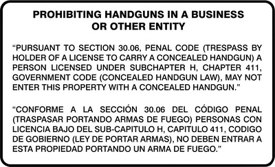 - Communicates Texas regulations for Conceal Carry (Code 30.06)