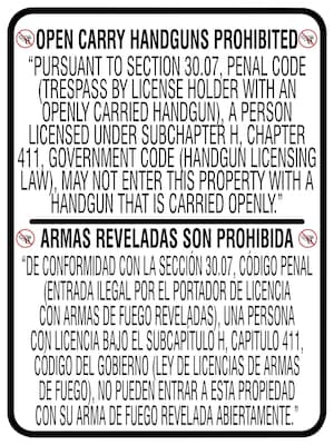 - Communicates Texas regulations for Open Carry (Code 30.07)